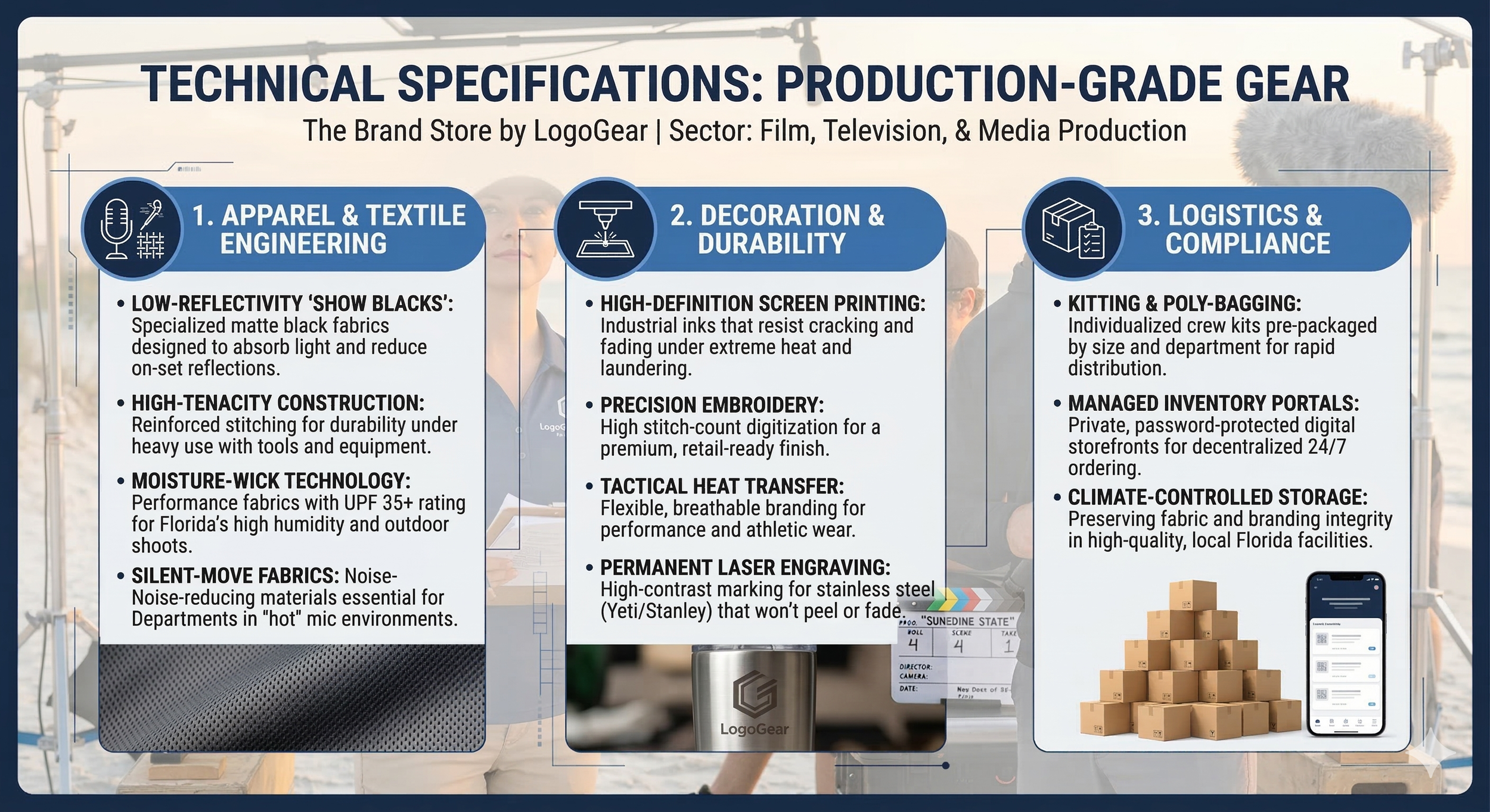 Technical Crew Apparel, Premium Wrap Gifts, and Managed Branding Logistics for the Florida Film Industry.